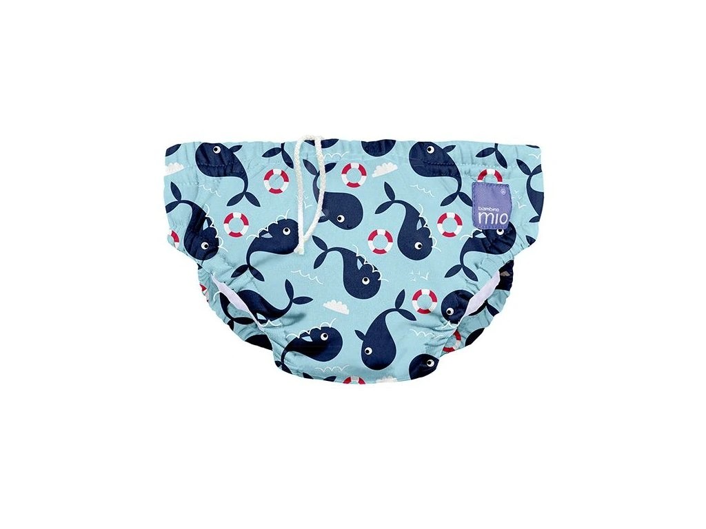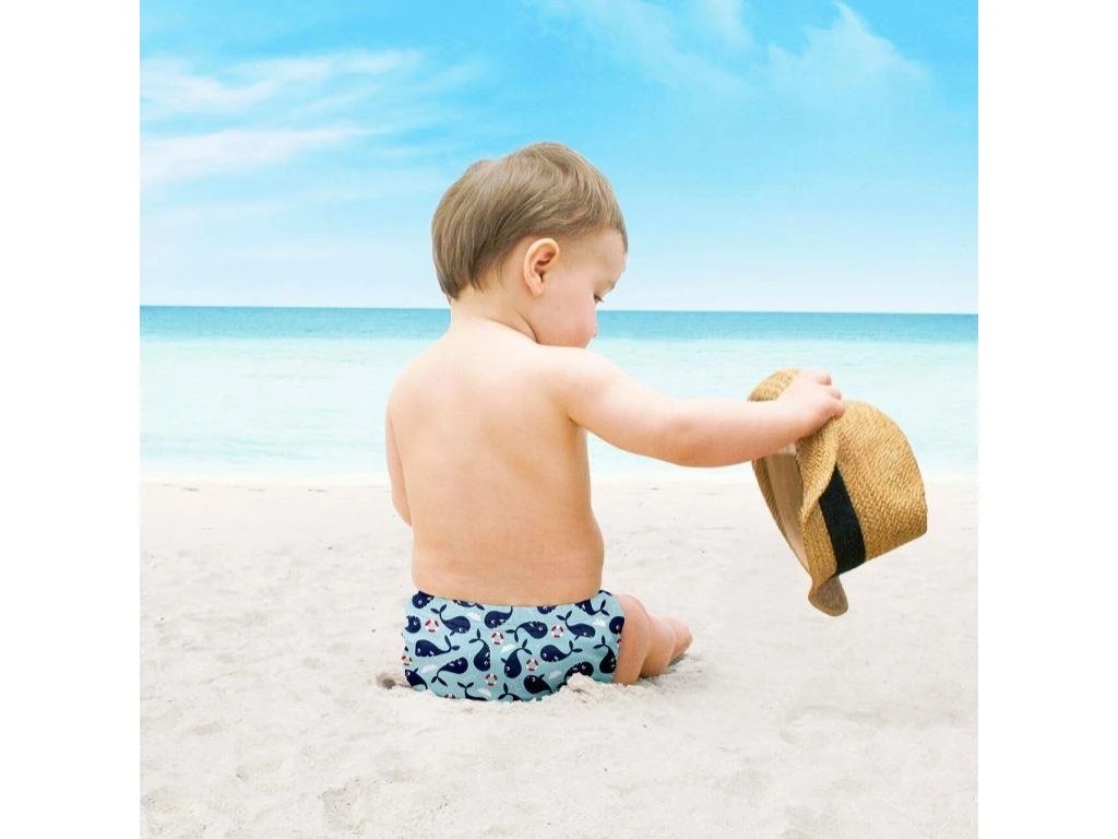 Modré kalhotky na koupání Whale wharf nabízejí oproti obyčejným kojeneckým plavkám a plenkám vhodné řešení. Jsou perfektní do plaveckých bazénů a na dovolenou. Velikost M - od 6ti do 12ti měsíců (7-9 kg).