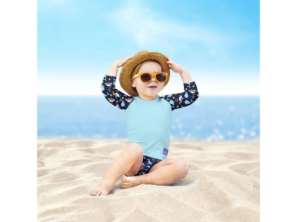 Perfektní UV50+ ochrana pro malé námořníky a objevitele! Chraňte pokožku dítěte s našim dětským tričkem do vody s UV filtrem. Tričko Nautical vhodně doplňuje plavky Bambino Mio, které najdete v souvisejícím zboží.
