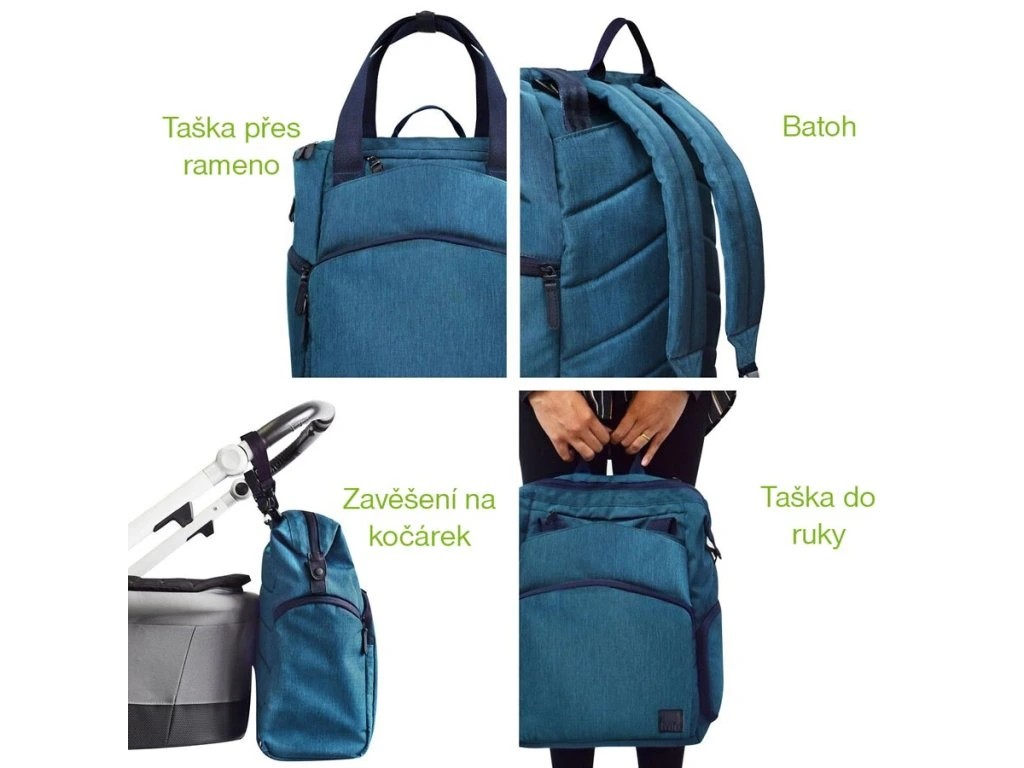 - Multifunkční použití – různé možnosti použití popruhů – jako taška přes rameno, batoh, připnutí na kočárek, nebo jen tak do ruky.